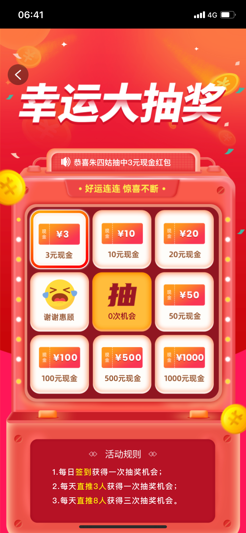一天签到抽奖3块满100就能提现我现在已经签到领到98了