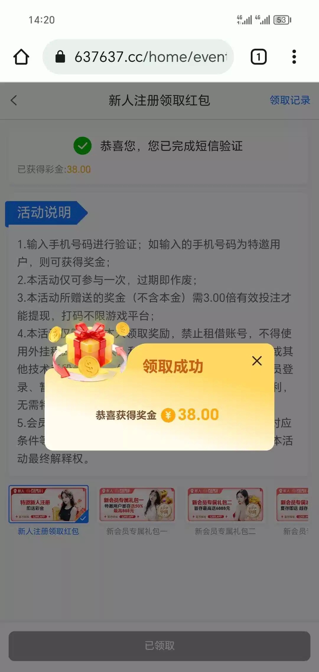 注册活动自助申请我领了38